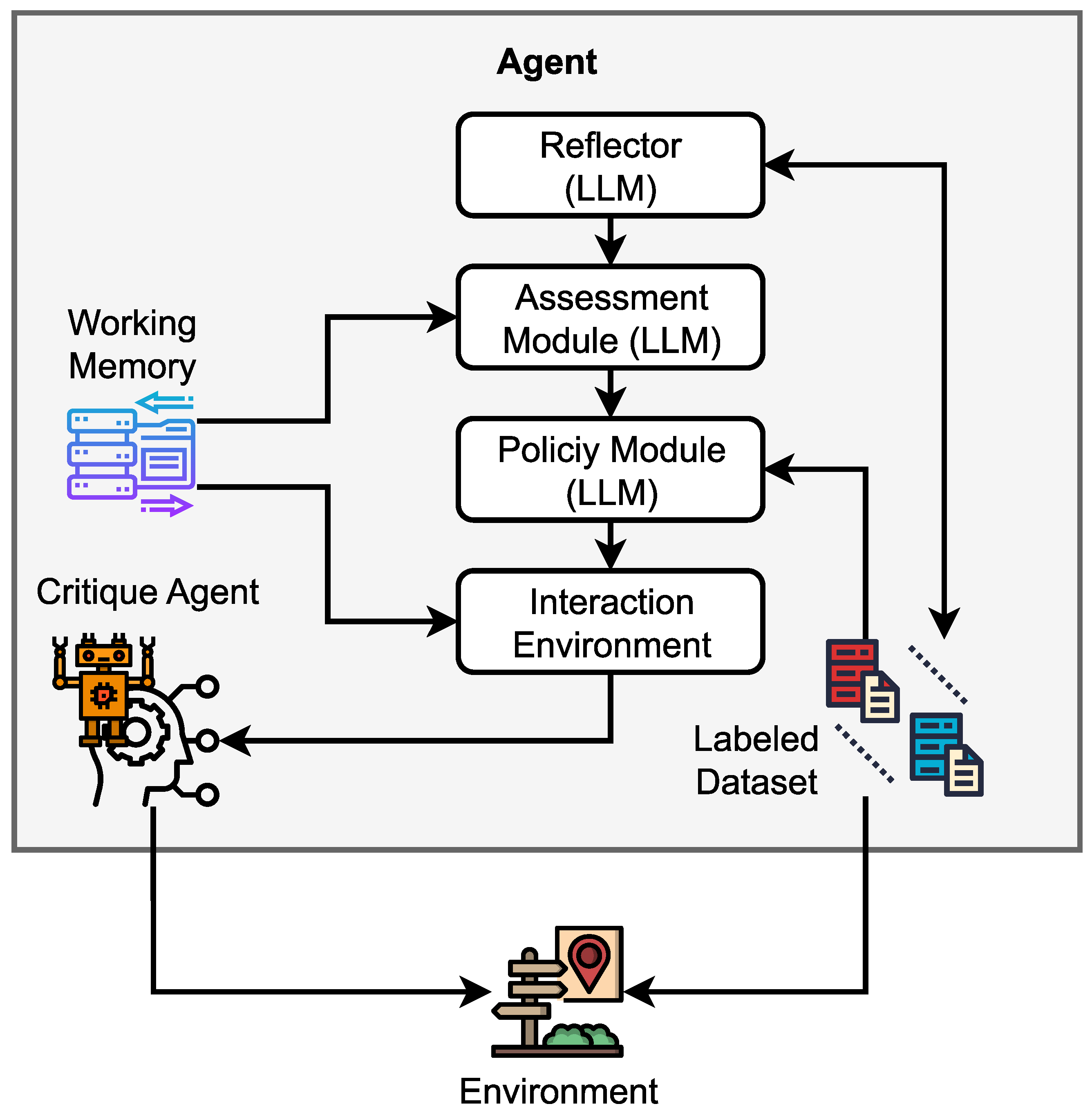Importantly, detecting an issue does not automatically result in correction. A dedicated policy decision stage determines the appropriate action: whether the annotation can be safely auto-corrected, should be flagged for review, or must be escalated to a human annotator. Confidence signals such as low model agreement, high uncertainty, or conflicting visual evidence play a key role in this decision-making process. The agent then acts within the interaction environment, applying corrections, generating quality flags, or routing samples to human reviewers. Corrections and reviewer feedback are captured and stored in working memory, along with downstream model signals such as training loss or prediction confidence.