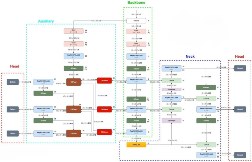 YOLOv9 employs an enhanced backbone incorporating PGI mechanisms, along with optimized feature aggregation pathways. This design improves feature reuse and learning efficiency while maintaining real-time performance.