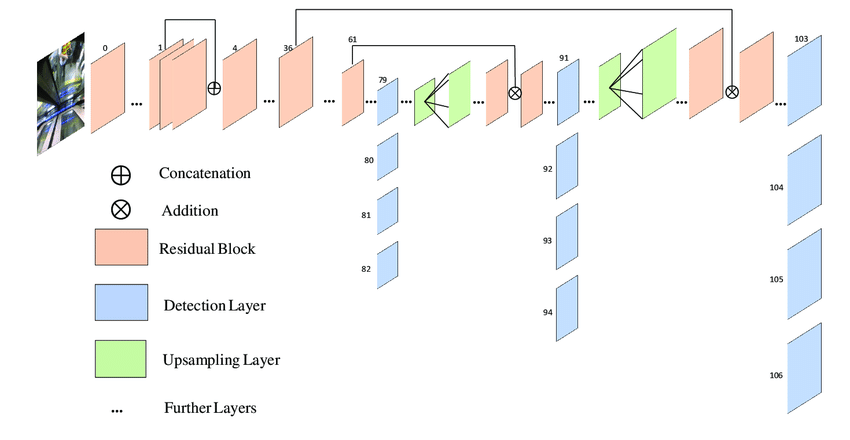 YOLOv3 uses Darknet-53 as its backbone network, which consists of 53 convolutional layers with residual connections inspired by ResNet. Detection is performed at three different scales, each connected to feature maps of different spatial resolutions using upsampling and feature fusion techniques similar to a feature pyramid network (FPN). At each detection scale, the model predicts: