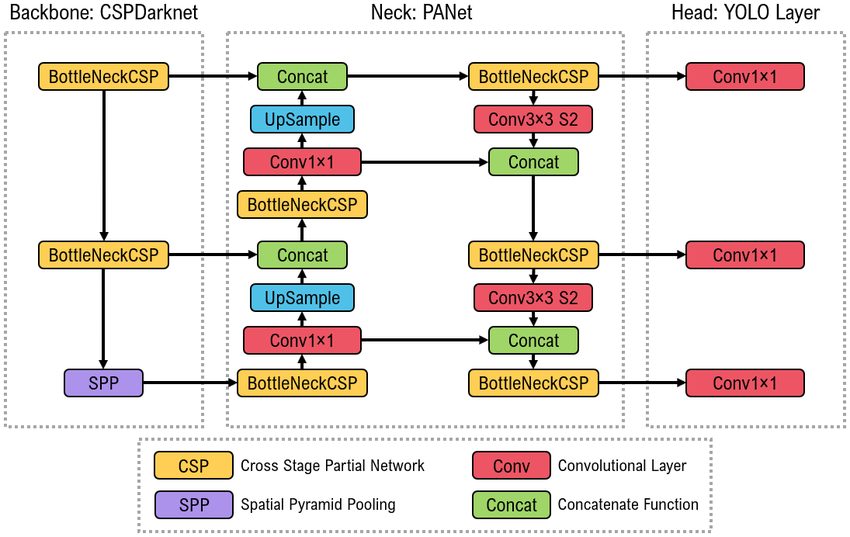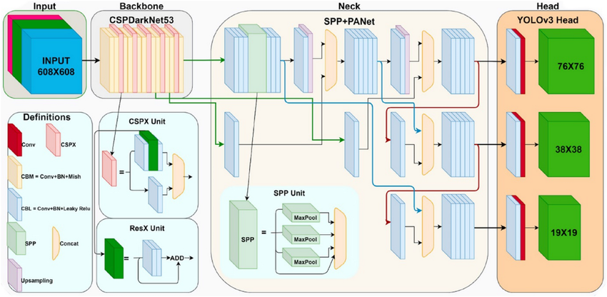The detection head follows the YOLO design principle, predicting bounding box offsets, objectness scores, and class probabilities at multiple scales. This architecture allows YOLOv4 to detect small, medium, and large objects effectively while maintaining real-time inference performance.