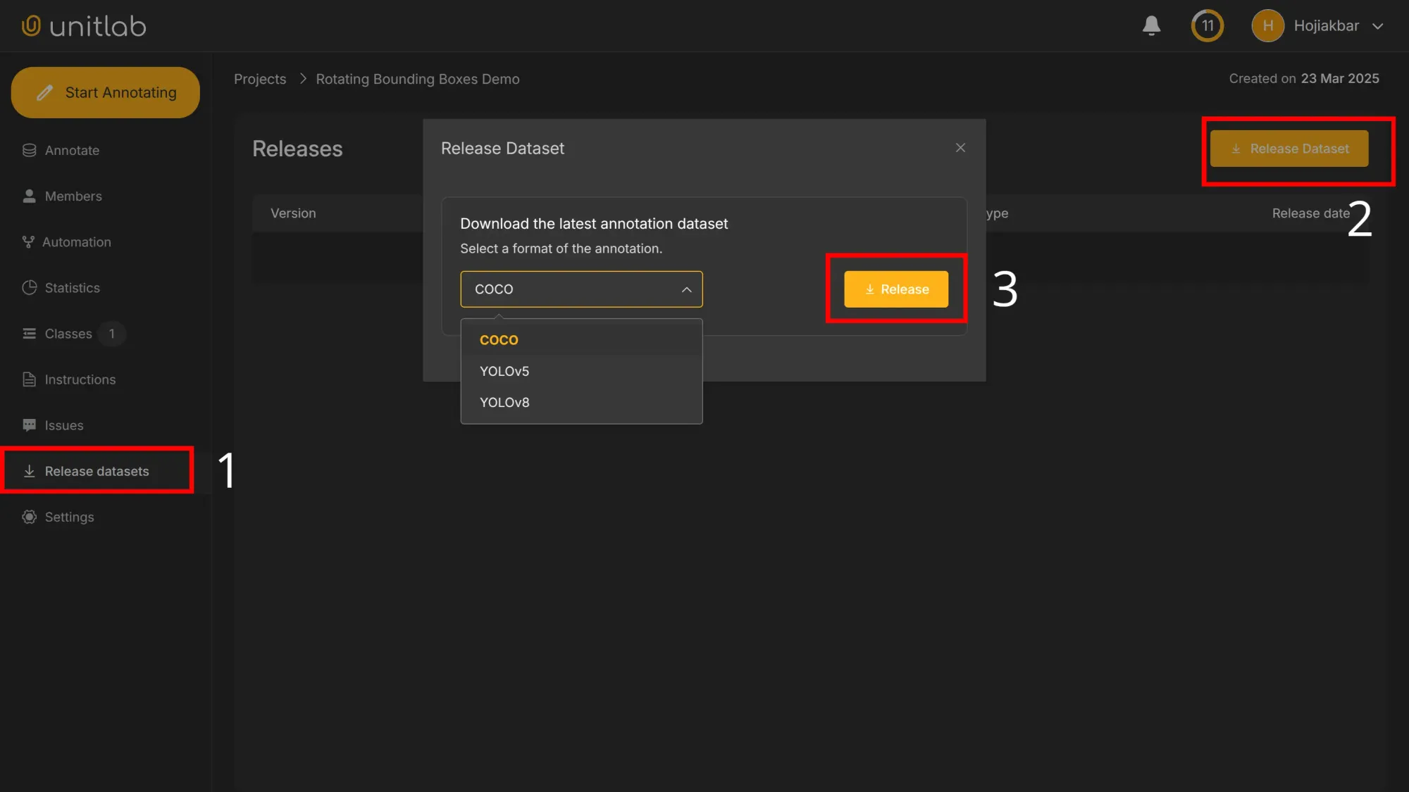 Go to Release Dataset within the project and release a dataset by choosing COCO as the dataset format: