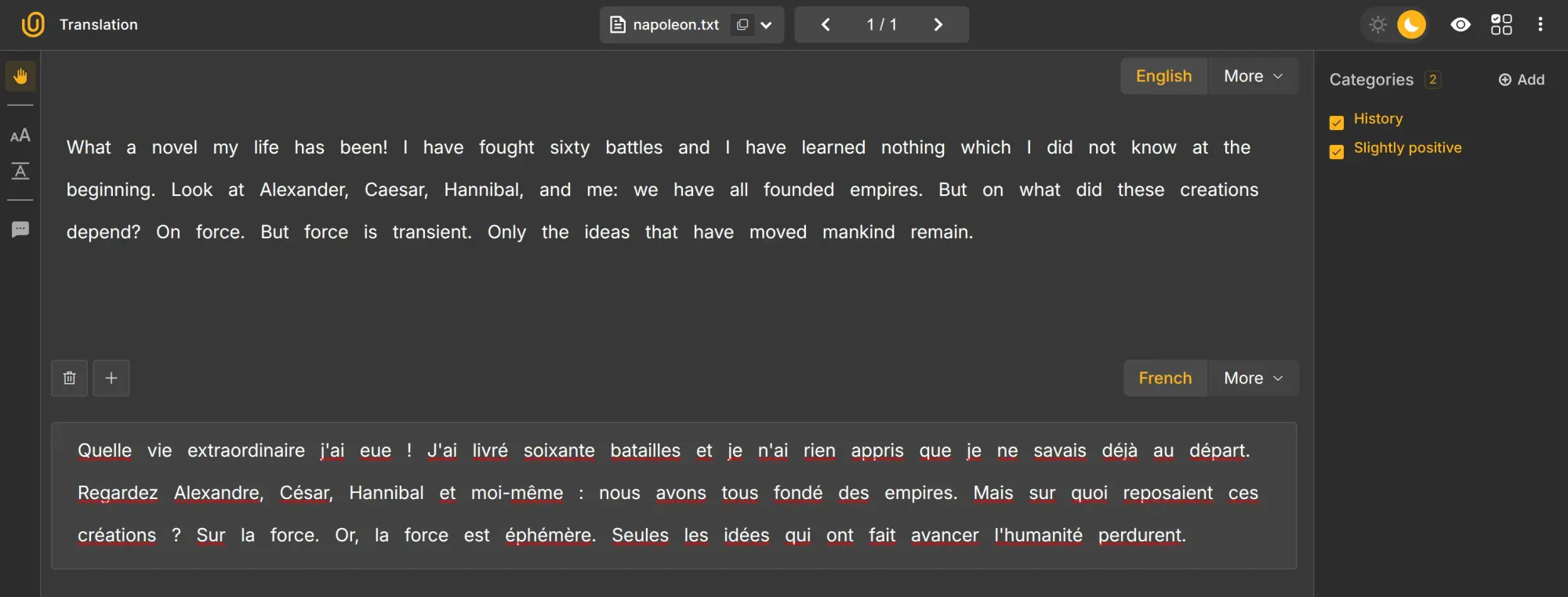 We can also combine modes, such as text translation, classification (History), and sentiment classification (Slightly Positive). Elegant, innit?