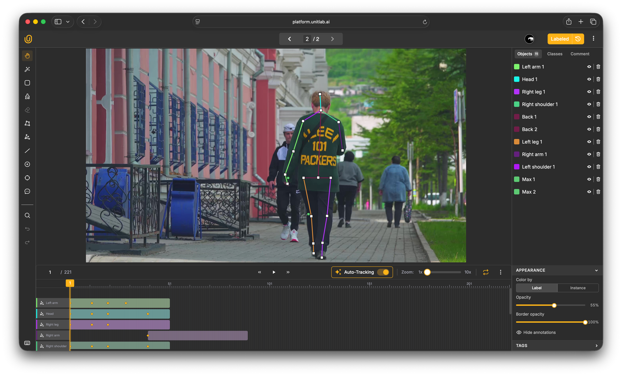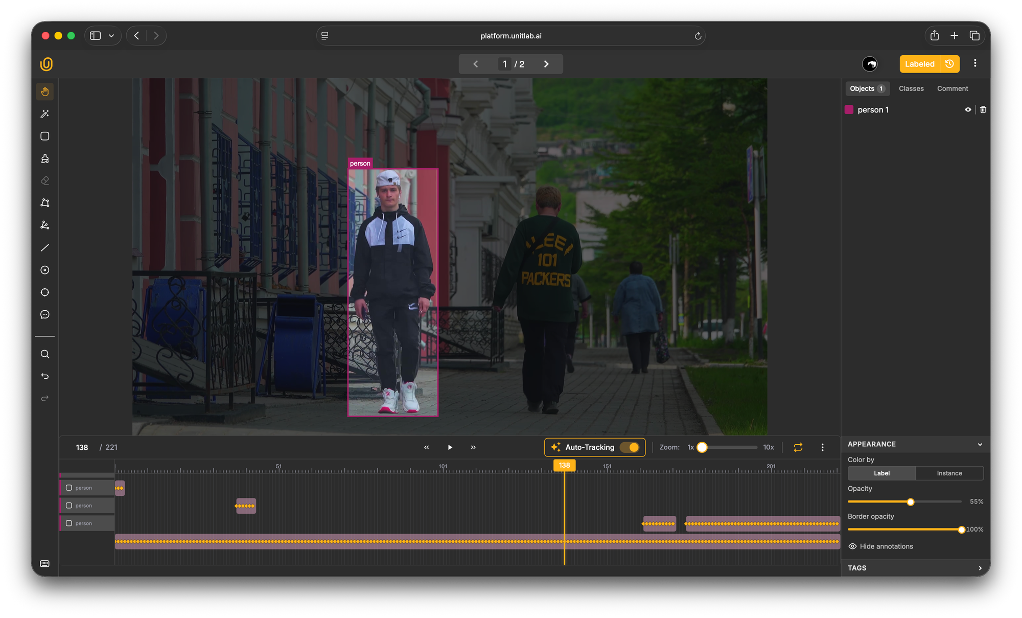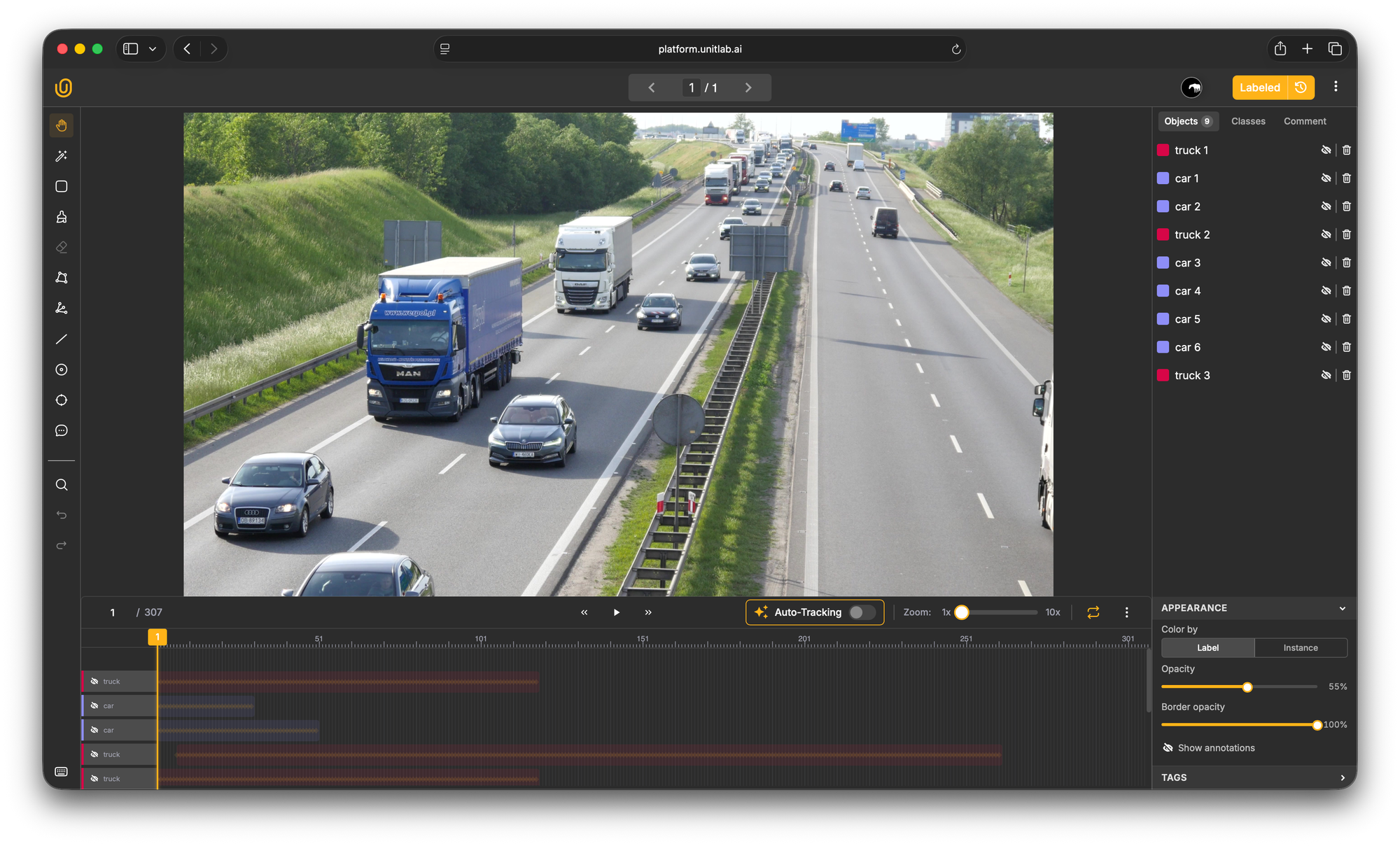 Unitlab's auto-tracking algorithm analyzes the object's visual appearance and motion, then automatically extends the annotation across subsequent frames.