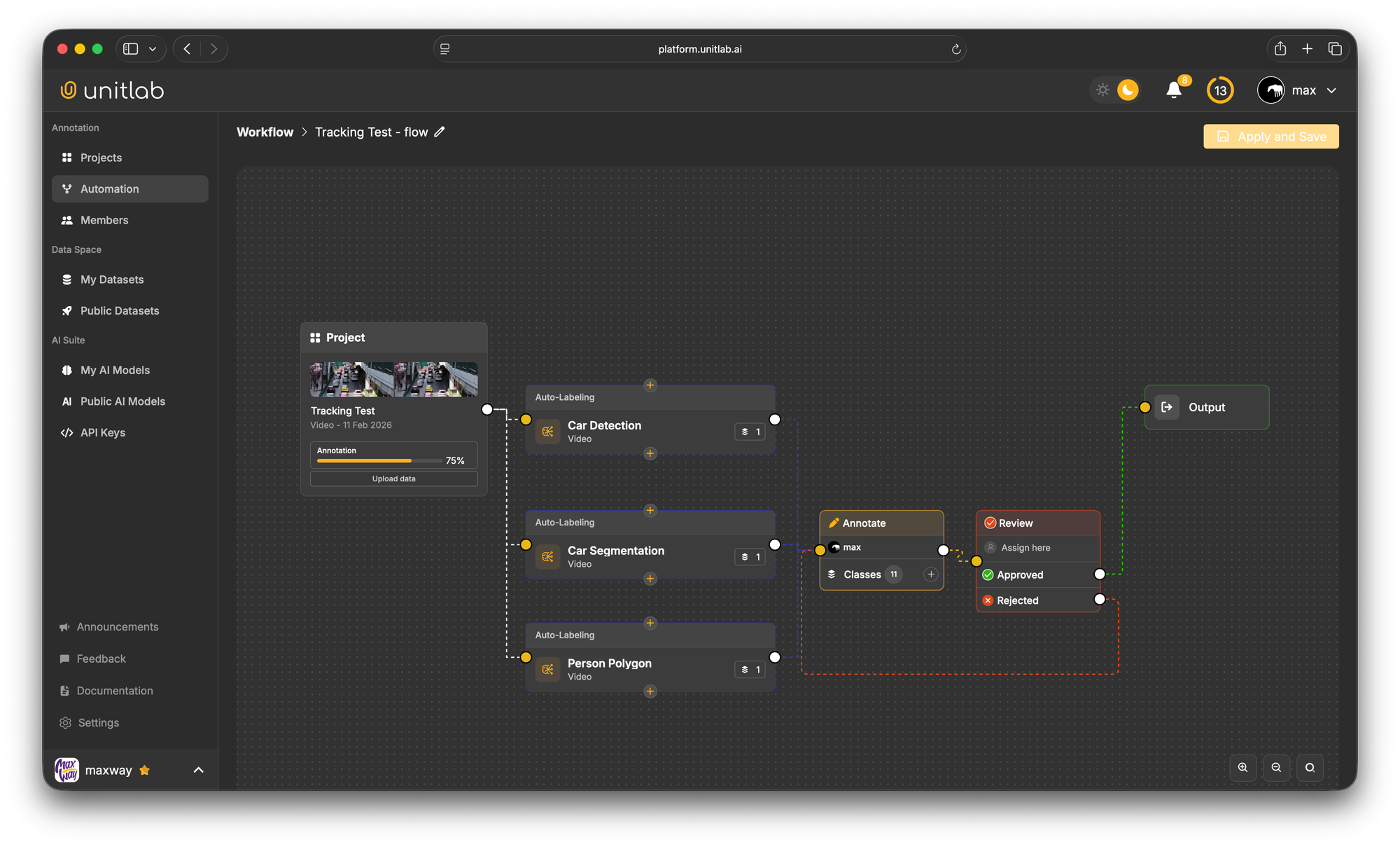 - Visual Automated Workflows: Allow teams to chain multiple auto-labeling models (such as detection and segmentation) and QA gates on a visual canvas to pre-label data before human review.