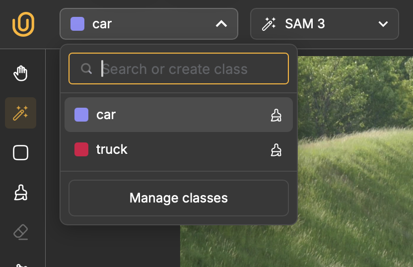 Before you start annotating, you need to create annotation classes for objects that appear in your video. In the class dropdown menu that appears next to the Unitlab AI logo, click Manage Class and name your first class like Car.