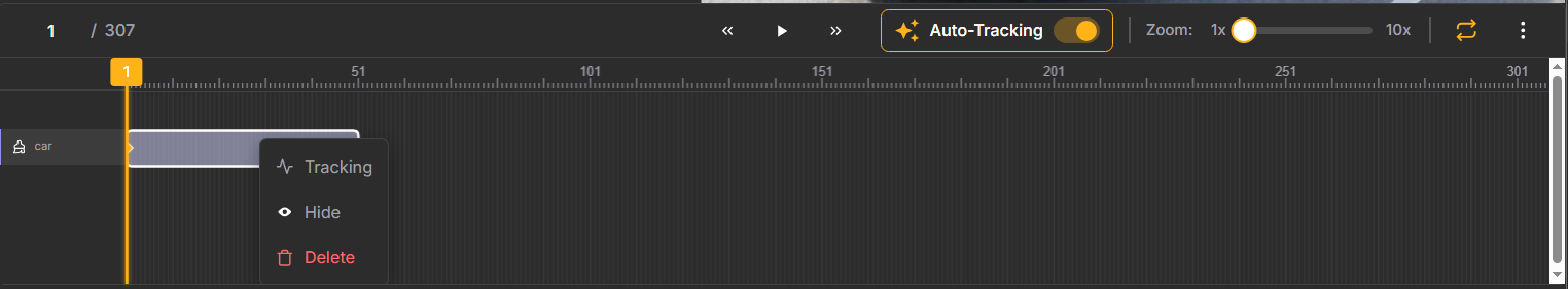 Once you've annotated an object in the initial frame, you can propagate that annotation across the video sequence. You can do that in two ways: either enable the Auto-Tracking option above the timeline (use it before annotating the object), or right-click the annotation on the timeline and select Tracking.