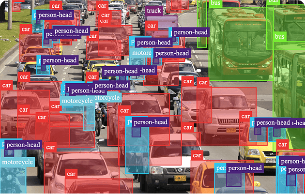 The image above showcases auto annotation inside Unitlab’s data labeling platform. In a dense traffic scene, Unitlab’s AI-powered labeling software automatically generates bounding boxes and multi-class labels such as car, bus, truck, motorcycle, and person-head across dozens of objects simultaneously.
