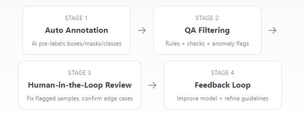 | Quality Control | Manual review cycles | Hybrid human-in-the-loop + annotation QA automation |