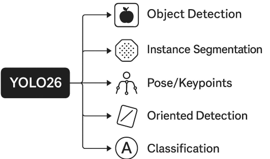 In addition to traditional object detection, YOLO 26 is designed as a unified computer vision framework that supports multiple vision tasks within a single model family. These tasks include object detection, instance segmentation, pose and keypoint estimation, oriented object detection, and image classification. By supporting multiple tasks under a shared architecture, YOLO 26 enables consistent workflows and simplifies deployment across different computer vision applications, as illustrated in Figure 2.